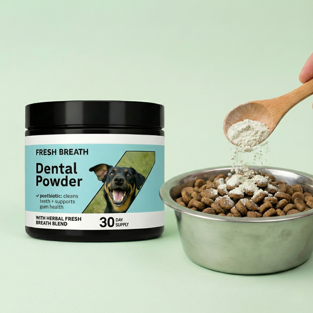 My Aussie would snap at me if I got near his mouth. Not possible to brush. This powder goes on his food without him knowing. Six weeks in and his breath is completely different — and not in a bad way.
