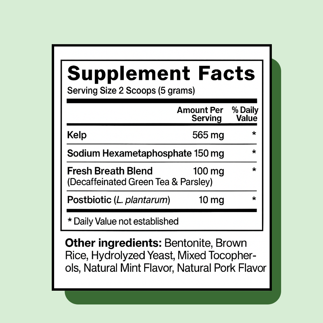 Most dental powders use seaweed-derived ingredients that work on the surface level. PupSmile's postbiotic enzyme formula actively targets the bacterial biofilm that causes both bad breath and plaque buildup. Full ingredient transparency — no proprietary blends hiding what's actually in it.